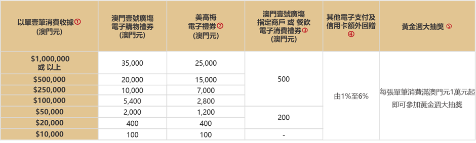 活动内容 : 于活动期间,包括首尾两日,顾客在澳门壹號廣塲或澳门美高梅指定商户消费10,000澳门元或以上,可换取BESPOKE隽环电子礼券及奖赏,根据以下消费层级于活动期间每个层级最多只可换取电子礼券一次。
